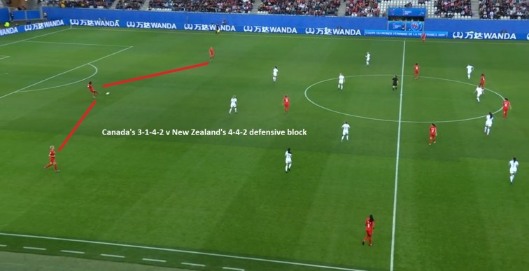 While the Netherlands, in their 4-3-3, were reduced to ‘u-shape’ passing among the back four by New Zealand’s compact defensive block, Canada’s back three made it easier for them to play around New Zealand’s two-player first line of defence – they would work the ball to one of the outside centre-backs, who could then drive forward with the ball at feet and had time to decide upon her next action.