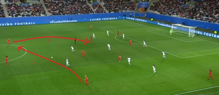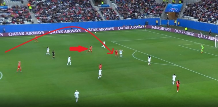 Another option was simply to bypass midfield and go over the first two lines of New Zealand defence, from centre-back to Sinclair. Sinclair, who is strong, aerially dominant and excellent with her back to goal, would regularly drop off the front line to receive chipped passes over the top. She would then hold the ball in before finding a teammate. Alternately, she would flick the ball on and a teammate would make the run in behind her.