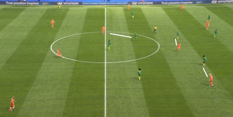 For the second game in a row, Netherlands struggled to effectively build out against an organised defensive team. They were also panicked by Cameroon’s strategy in transition – playing directly over the top of the Netherlands back line at every opportunity, looking for the runs in behind of their forwards. Onguene was a particular threat in transition, with her pace and movement allowing her to break the last line in such situations. She ended up scoring Cameroon’s equalising goal from this type of scenario.