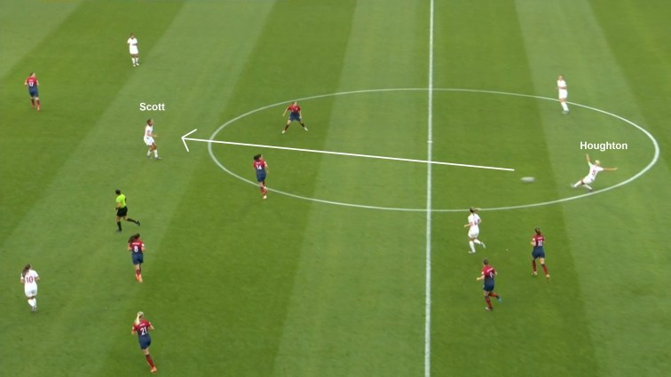 Houghton showed her quality on the ball on a number of occasions to pick through balls to Scott and break two lines of Norway defence in the process. From there, England could attack Norway’s last line of defence with Scott and Kirby running forward, White attacking centrally and Parris and Duggan looking to get around the outside.