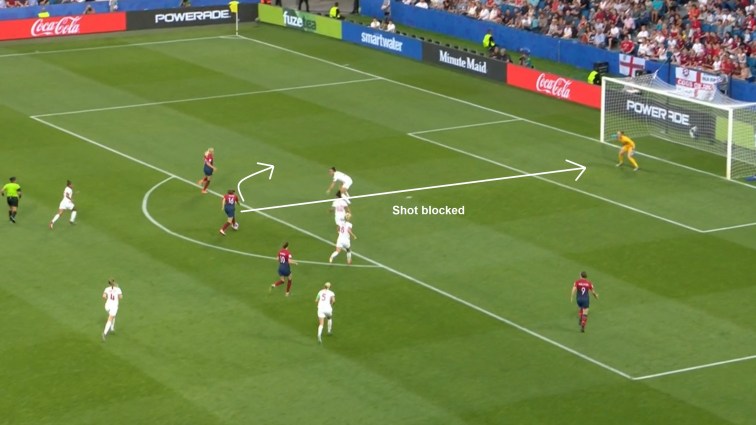 Norway defended in a more passive 4-4-2 mid-block, as they had done throughout the tournament, and looked to force England possession wide or intercept attempted through balls. While Australia and France didn’t penetrate their block, England were more able and willing to do so. Scott and Kirby took up positions between the Norwegian midfield and defensive lines and in the channels between Norwegian midfielders; England then passed from side to side around their back four looking to stretch Norway’s midfield line and find gaps to play through and find their No.8s.
