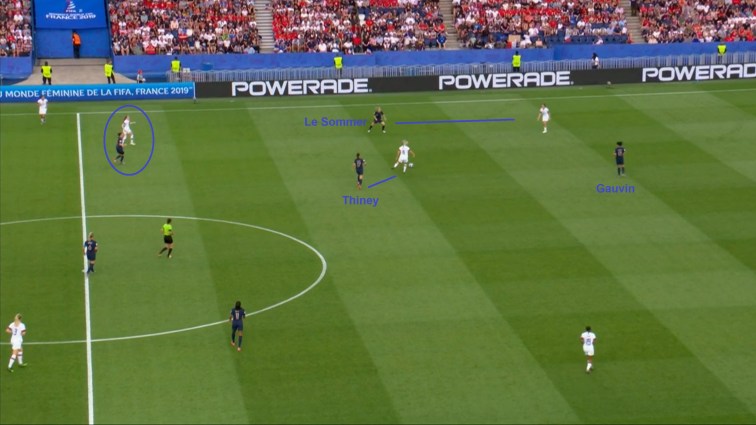 Even if they could find Henry or Bussaglia, France simply aren’t set up to break the lines. Le Sommer came inside from her left wing role and took a more central position, while Thiney also took up some good positions in the channels on USA’s midfield line. But they were rarely found as France build-up is geared towards setting up with short passes between the centre-backs and double pivot, allowing the full-backs to push up and spraying diagonal balls out wide for overloads and crosses or dribbles and cut-backs from their wingers. By making it harder for France to set up these wide attacks, the USA stopped their hosts from getting into any rhythm with their possession.