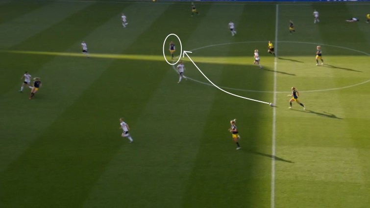 Here, she makes a forward run that pins back Italy right-back Bartoli, stopping the Italian from pressuring and allowing Martens (circled) to receive in more time and space on the wide left.