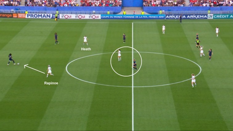 Both Torrent and Majri push on offensively for France, and this leaves gaps on either side of their central defenders. Here, Heath and Rapinoe were positioned well to run into these gaps. Instantly upon winning possession, the USA played balls over the top or through into these areas for Heath or Rapinoe to run onto and attack. In the example below, Morgan drops deep to receive in transition (Renard and Mbock can’t follow her as they are essentially the only defenders left) and immediately plays a through ball for Rapinoe. People have criticised Renard at this tournament, but her and Mbock have been left high and dry in transition by the French system time after time, and the USA took advantage of this consistently.